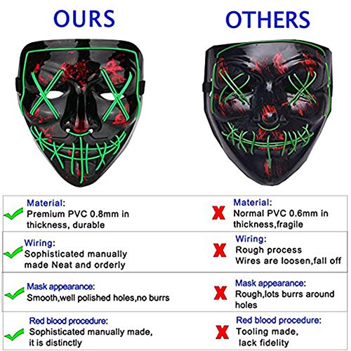 - 【LUZ FRÍA LED】 Esta máscara de halloween utiliza tecnología de luz fría LED, su luz no causará tensión ni fatiga en los ojos. El uso de la tecnología del color lo hace lucir más genial