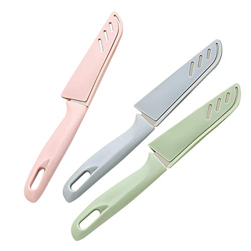 Juego de 3 cuchillos de fruta, afilados y duraderos con cubierta protectora, apto para la mayoría de tipos de verduras y frutas (rosa, azul, verde)