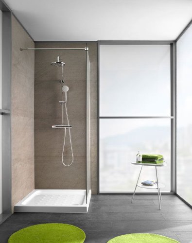 - COLUMNA DE DUCHA COMPUESTO DE: Cabezal de ducha de lluvia grande (Ø 220 mm), cabezal de ducha de alta presión modelo 3, brazo de ducha de latón (335 mm), manguera de ducha flexible (1,5 m), riel de ducha ajustable, mezclador termostático de ducha y soporte de ducha de mano.