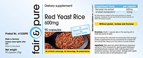 - Para su salud: Arroz Rojo 600mg con 4.5mg de Monacolin por cápsula, vegano, 90 cápsulas. El producto no contiene gluten, fructosa, lactosa, estearato de magnesio, dióxido de silicio, colorantes, aromatizantes ni conservantes.