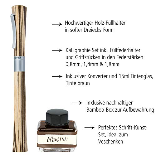 Online 37712 - Juego de plumas estilogrĂĄficas (1,4 mm, agarres 0,8 y 1,8 mm, frasco de tinta marrĂłn y convertidor, caja de bambĂș)