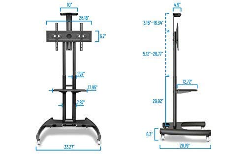 - El accesorio de estantería ajustable es perfecto para los reproductores multimedia, los dispositivos de videojuegos u otro equipo y puede soportar un peso de hasta 4,5 kg.La altura de la televisión se puede ajustar de 103 cm hasta 153 cm en intervalos de 5 cm (del suelo al centro de su televisión).
