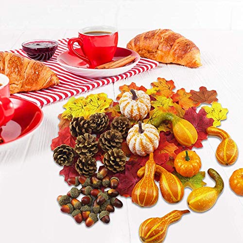 - El paquete incluye: 4 mini calabaza artificial, 100 hojas de arce, 48 bellotas, 6 calabazas, 8 conos.