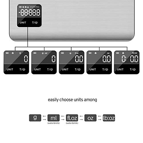 - 【Medir con Confianza】La Báscula Digital para Cocina de acero inoxidable se puede medir con precisión los alimentos sólidos y líquidos con facilidad y comodidad, permitiéndole controlar completamente las porciones de comida, condimentos y la nutrición. Con una capacidad de 11 libras (5 kg) y la división de 0,1 oz (1 g), esta báscula de alimentos digital proporciona resultados precisos en lb / oz, g, ml, y fl.oz.
