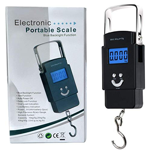 - Flybiz Escala digital portátil de con capacidad de pesaje de 110 lb / 50 kg. Medición en LB, JIN, OZ, KG. Rango de Peso / Graduación: 110 lb / 50 kg; 0 ~ 10kg: d = 5g, 10-50kg: d = 10g.