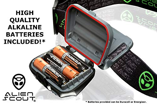 Alien Scout Linterna Frontal Gama Alta – Impermeable, Resistente a los Golpes y Súper Brillante - Tecnología Cree XP-E LED – Múltiples Modos de Alumbrado Fijo e Intermitente - Blanco/Rojo/SOS