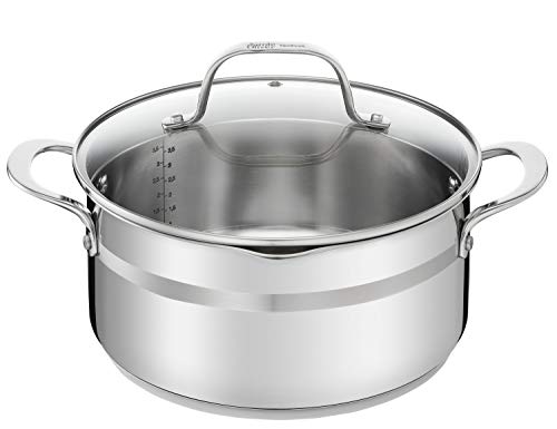 - Cacerolas Acero Inoxidable 18/10 con base extra gruesa de 5,3 mm para evitar deformaciones y ofrecer una cocción uniforme, asas con recubrimiento aislante para evitar alcanzar temperaturas extremas