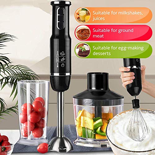 - ▶ [Batidora de mano 4 en 1 multifunción]: La batidora de mano fue diseñada para mezclar, picar, batir, batir, hacer puré y emulsionar según sus tareas de cocción con un eje de batidora de varilla de acero inoxidable y una cuchilla en forma de S, un batidor de acero inoxidable, un cuenco picador de 500 ml y un batidor de batido de 800 ml.