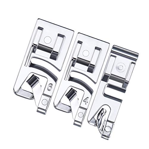 - 2.3 Tamaños diferentes: el prensatelas de dobladillo enrollado angosto incluye 3 tamaños diferentes, 3 mm, 4 mm y 6 mm, que le ayudarán a crear hermosos dobladillos enrollados diferentes en tejidos ligeros con facilidad.