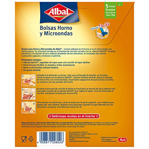 - Contenido: 1 x bolsas de asar para horno y microondas Albal, 5 unidades, incluye válvulas de cierre, tamaño 35 x 43 cm, capacidad máxima 5 kg