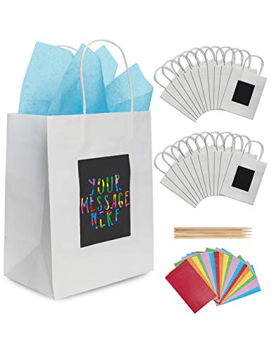 - 24 Bolsas para regalo con asas, lo cual facilita su transporte. También se incluyen 12 rascadores con forma de bolígrafo para escribir su mensaje personalizado, 7 papeles de distintos colores para envolver, y ¡una muestra gratuita de pegatinas y más! Con estas bolsas, ¡envolver regalos es mucho más fácil!
