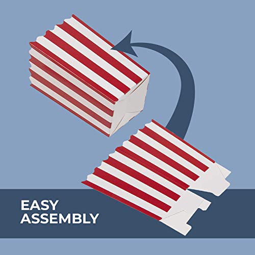 - Cajas de palomitas de maíz aprobadas por la FDA: El juego incluye 100 cajas de regalo de palomitas de maíz. Están hechos de papel aprobado por la FDA de 230 g/m², estos recipientes de palomitas cuentan con bordes festoneados en el clásico diseño rojo y blanco.