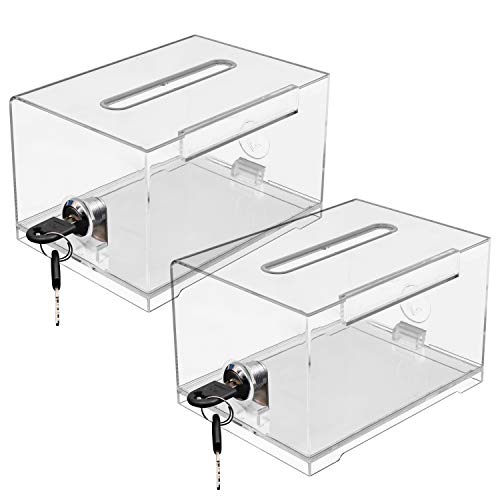 - PACK DE 2: Este pack de 2 cajas de sugerencias de acrílico con cerradura está perfectamente diseñado para mantener sus contenidos seguros. Cada caja mide 15,9cm de largo, 11,5cm de ancho y 10cm de alto. La ranura mide 10,16cm de largo y tiene un ancho de 1cm.