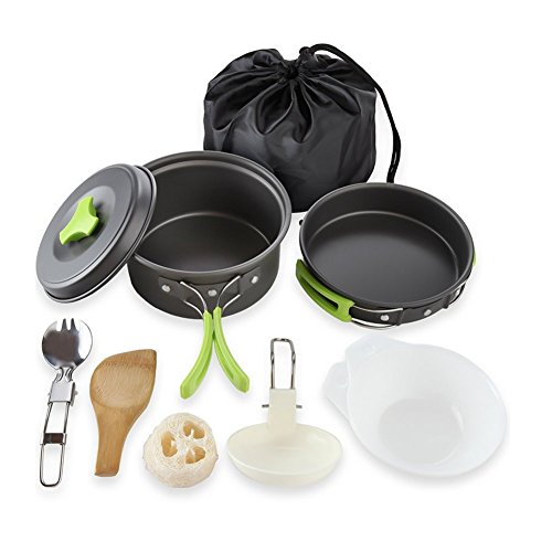 Qtiwe 10 piezas Cookware Kit Picnic Ollas Cocina camping Juego de vajilla para 1 - 2 personas para camping Outdoor Senderismo Picnic BBQ, FDA Certificación
