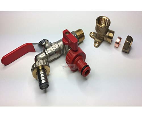 Wärmer System Grifo de jardín de doble salida + codo de placa de compresión para pared, 15 mm, latón, para