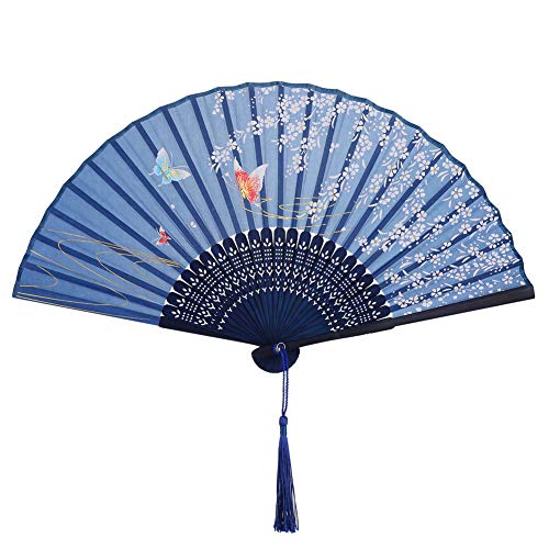 VICKSONGS Abanico de Mano, Japonés Seda Ventilador Plegable de Mujer con Borla, Abanico de Mano de Bambú para Pared Decoración Fiesta Boda Baile Regalo (Azul Oscuro)