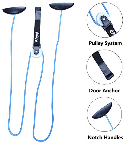 - La polea para hombros se puede enganchar en cualquier punto del marco de la puerta, lo que permite realizar un amplio abanico de ejercicios desde múltiples ángulos. La longitud de la cuerda es ajustable, lo que le otorga una gran versatilidad en cuanto al número de ejercicios que se pueden realizar