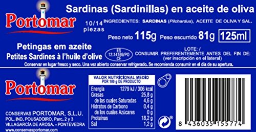 - Ingredientes: sardinas, aceite de oliva y sal.