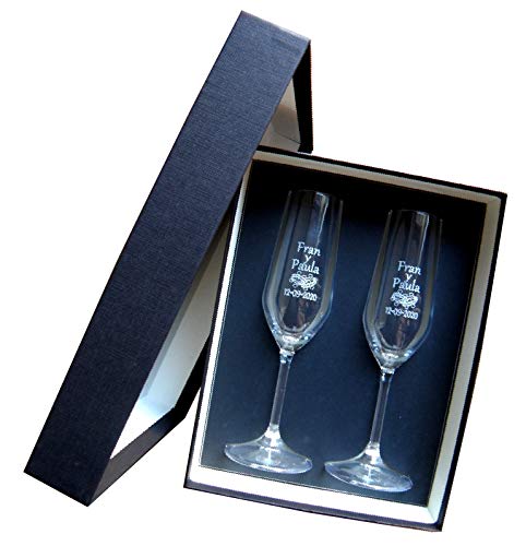 - Estuche troquelado con 2 copas de cava grabadas y personalizadas con ANILLOS BODA. La capacidad de las copas de cava es de 205 Ml. Copas de cava de cristal bajo en plomo y excelente transparencia. Regalo cumpleaños, Aniversario, Día del padre o madre, jubilación, regalo práctico, elegante, original y divertido para hombre o mujer.
