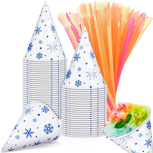 - Excelentes suministros para fiestas: vienen con 100 piezas de copas de cono de nieve con patrón de copos de nieve y 100 pajitas de cucharas de colores mezclados para chupar y recoger la comida fácilmente, lo suficiente para completar la preparación de los suministros para la fiesta