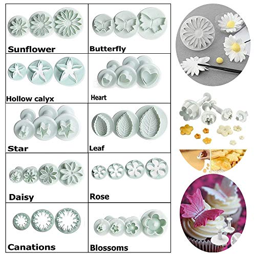 - Práctico y versátil: con 33 moldes de fondant, los amantes del horneado pueden hacer rápidamente casi cualquier idea de decoración como flores, mariposas, estrellas, hojas y mucho más. Cortadores de galletas para fondant, decoración de tartas, galletas, postres, chocolate, tartas, gelatina, postres.