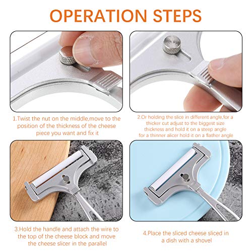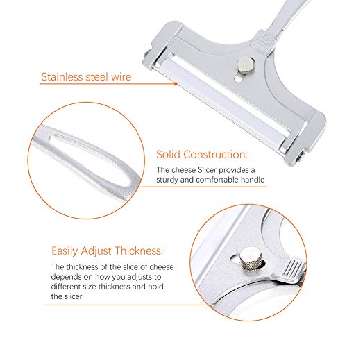- Diseño ajustable: puedes ajustar a diferentes tamaños de grosor para adaptarse a tus propias necesidades, puedes sostener el cortador de queso en un ángulo de inclinación y ajustar al grosor más grande para rebanadas de queso más gruesas, y sostenerlo en un ángulo más plano para rebanadas de queso más delgadas.