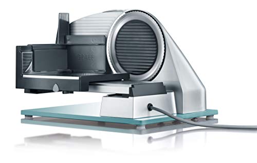 - Incluido en la entrega: Cortafiambres metalizado en plata con Cuchilla dentada, Bandeja de recogida de productos cortados, Carro de rodadura fácil, Recogedor de restos, Instrucciones de uso