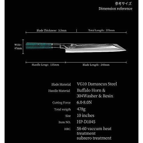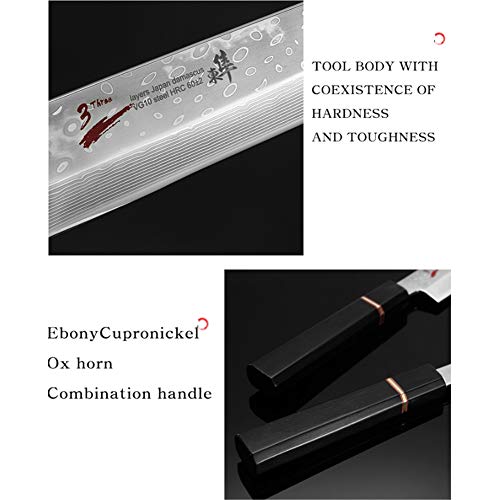 - Material de la lámina: 33 capa de cuchillo VG10 Damasco de Japón, Material de la manija: ébano, cuproníquel, cuerno vida combination.Long y fácil de sharpen.Ideal para filetear el pescado, perfecta para cortar pescado crudo para el sashimi.
