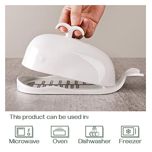 - 【TAMAÑO GRANDE PARA LA MANTEQUILLA ORIENTAL / OCCIDENTAL】 - Este gran plato de mantequilla se adapta perfectamente a la mantequilla oriental y europea. Hay suficiente espacio entre la parte posterior de la tapa y la cola de la ballena para descansar su cuchillo de mantequilla. Además, la línea elevada en la parte de cola de pez mantiene la mantequilla en su lugar una vez que colocas un palo nuevo hacia abajo.