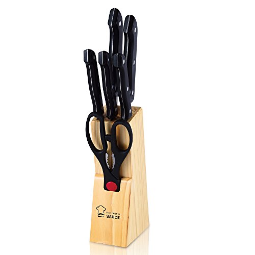- Incluye: cuchillo de cocinero 21 cm, cuchillo de pan 21 cm, cuchillo deshuesador 14 cm, cuchillo multiusos de 12.5 cm, cuchillo mondador 8 cm, tijeras 21 cm y tacoma de madera