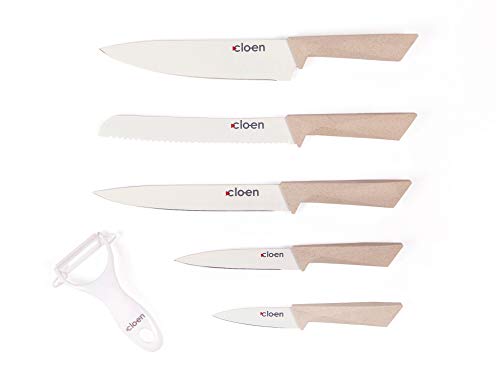 Set de 6 piezas, cuchillos de acero inoxidable con pelador de hoja cerámica. Modelo CLOEN CHEF. 5 cuchillos de acero inoxidable con recubrimiento antiadherente y 1 pelador con hoja cerámica.