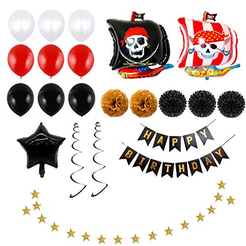 - El paquete incluye: globo pirata negro de 8 * 12 pulgadas, globo rojo de 8 * 12 pulgadas, globo blanco de 8 * 12 pulgadas, globo dorado de 8 * 12 pulgadas, pancarta de cumpleaños pirata de 1 * 26 pulgadas, globos de papel de barco pirata negro de 1 * 26 pulgadas, barco pirata blanco de 1 * 26 pulgadas Lámina, 3 * tatuaje pirata temporal.