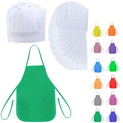 Haichen - 12 Gorros de Chef Desechables de Papel Blanco Ajustables para niños con Delantales de Tela de Artista para niños de 12 Colores para Cocina, Aula, Manualidades para Hornear