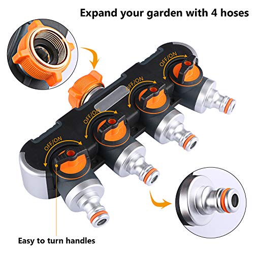- 4 ventanas de riego – Convierta un grifo de jardín en 4 salidas, muy práctico para el control del riego multitarea, para el riego de jardín, lavado de mascotas, coches y máquinas. Puede utilizar una salida individual o varias salidas. Es una gran solución para el riego de jardín.