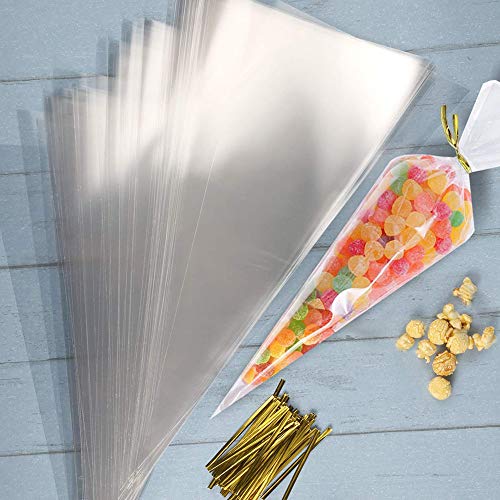ysister Bolsas de Cono Transparentes 200 Piezas Bolsa de Regalo Bolsa de Dulces Bolsas de Celofán con Lazos para Dulces Galletas Regalos Fiestas cumpleaños 17×37cm
