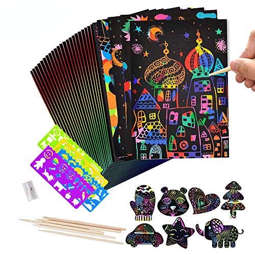 - Deje Que Su Espíritu Creativo Brille - Utilice un rascador para eliminar la superficie mate negra del papel, revelando el brillante color del arco iris a continuación! Haz excelentes kits de dibujo para niños! También un gran regalo