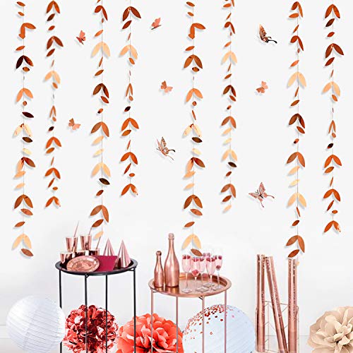 - Contenido del paquete: 2 guirnaldas de hojas de oro rosa, 8 flores de papel pom poms, 2 farolillos blancos de papel, 1 farol de papel con puntos de hoja de oro rosa, adhesivos mariposa 24 × oro rosa, 3 cintas de oro rosa.