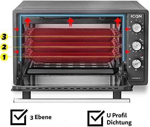ICQN mini horno con aire forzado | Horno de pizza | Mini horno | Iluminación interior Doble acristalamiento | Función de temporizador | Esmaltado (Inox gris, 42 litros)