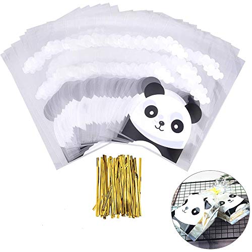 Ulife Mall 100 Piezas Bolsas de Celofán Bolsas de Dulces Plástico Autoadhesivas + 100 pcs Lazos , Patrón de Panda Bolsa de Regalo para Frutos Secos, Galletas, Caramelos, Chocolate (8 x 6.3 Inches)