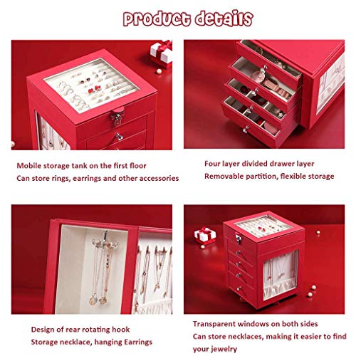 Caja De Joyería, PU Cuero 5 Capa Gran Capacidad Caja Organizadora De Joyas Rotativo Retirable Bandejas De Exhibición De Joyería para Anillos, Aretes, Pulseras Y Collares-Rojo