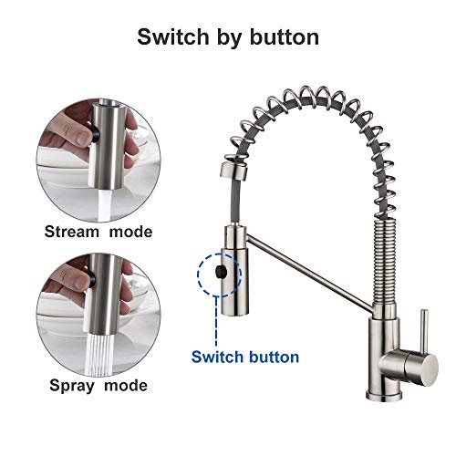 - Diseño Profesional: Diseño resorte, la combinación perfecta de acero inoxidable y laton, simple y moderno. El aireador de ABS con 2 funciones, pulverización y transmisión, haciendo clic en el botón en el pico, sin salpicaduras y reducción de ruido.