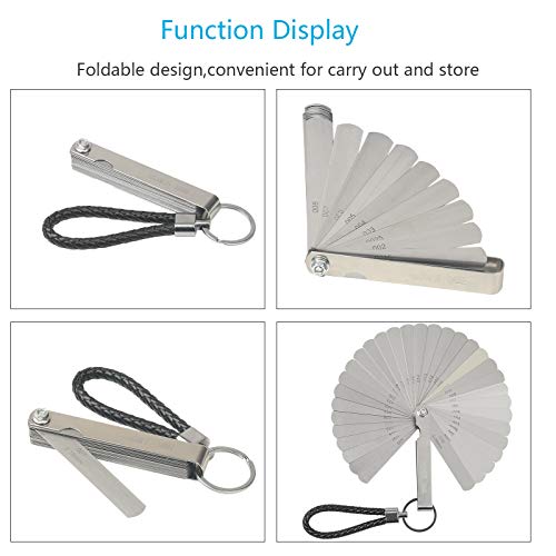 - juego de galgas: cada juego de galgas medida tiene 32 espesores diferentes de láminas, diseño ligero y pequeño, usted lleva muy fácil y puede poner en el bolso de pantalones sueltos.