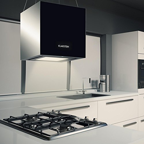 Klarstein Kronleuchter - Campana extractora en isla, Flujo aire hasta 600 m³/h, Iluminación LED, Eficiencia energética Clase A, 3 niveles, Filtro grasa, Control táctil, 45 x 45 x 45 cm, Negro