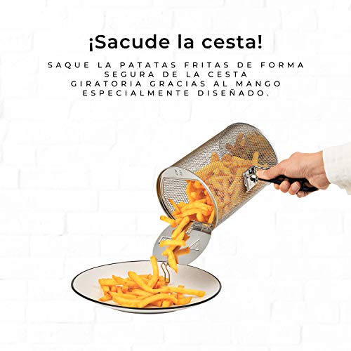 - Accesorios incluidos: el horno freidora viene equipado con 1 cesta para patatas fritas giratoria y su asa, 3 rejillas de cocción, 1 pincho para asar y su asa