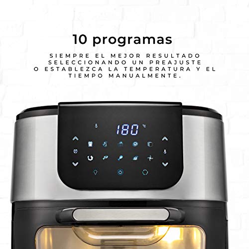 - Multifunción: asar, tostar, freir, deshidratar, descongelar, 10 ajustes preprogramados o manejo de forma manual para cada necesidad: patatas fritas (2 o 3 raciones a la vez), asar un pollo