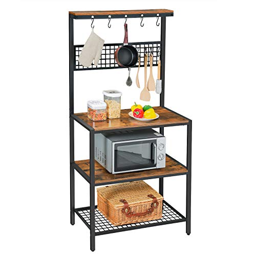 VASAGLE Estante de Cocina Industrial, Mueble de Cocina con estantes, 10 Ganchos y Estante de Malla Metálica, Estante para Utensilios de Horno de Microondas, 84 x 40 x 170 cm, Marrón Rústico KKS17BX