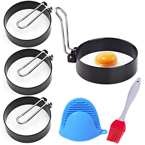 Anillos de Huevo Antiadherentes, KECRULV 4 Piezas Moldes Para Huevos Fritos de Acero Inoxidable con Cepillo para Hornear de Silicona y Guantes de Silicona para Horno, para Huevos Frito y Panqueques