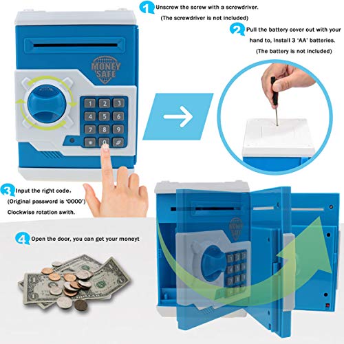 - 【Los niños serán más conscientes de la seguridad de su dinero】 - tendrán una caja fuerte que vigile sus pertenencias. Se puede utilizar para almacenar juguetes, joyas, tarjetas de béisbol, etc. Inserte las monedas en la parte superior de la hucha e inserte los billetes en el lateral. Simplemente utilice la caja fuerte como una hucha.
