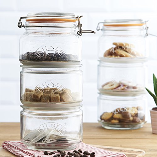 - El juego de tarros apilables Kilner cuenta con una tapa de clip de 0,9 litros y dos tarros de 0,88 litros.