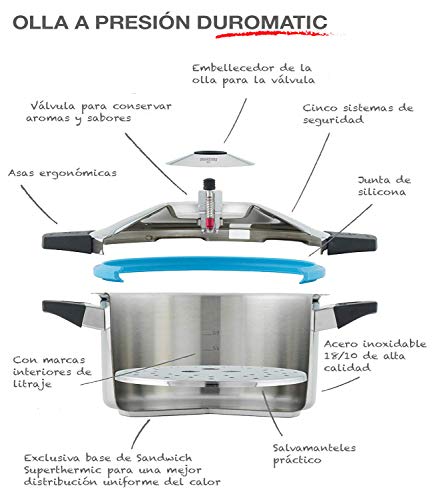 - Olla compuesta por una avanzada válvula de resorte que refleja con precisión los tiempos de cocción, dispone de la máxima seguridad asigurada con 3 seguros de sobrepresión y un dispositivo de cierre de la tapa automático para evitar que la olla pueda ser abierta bajo presión